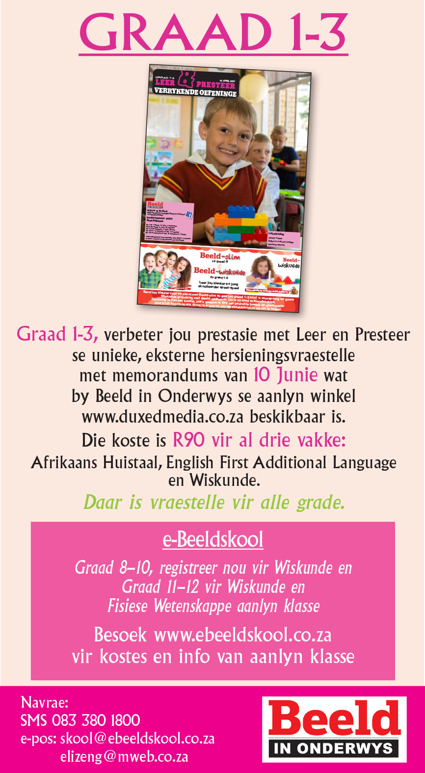 Leer en Presteer fokus op oefenvraestelle met memorandums vir alle grade om leerlinge te help om hul kennis te toets en hul skoolwerk maklik te maak. Ons gee jaarliks 15 uit, 3 per fase Graad R-3, 4-6, 7-9, 10-11 en 12.