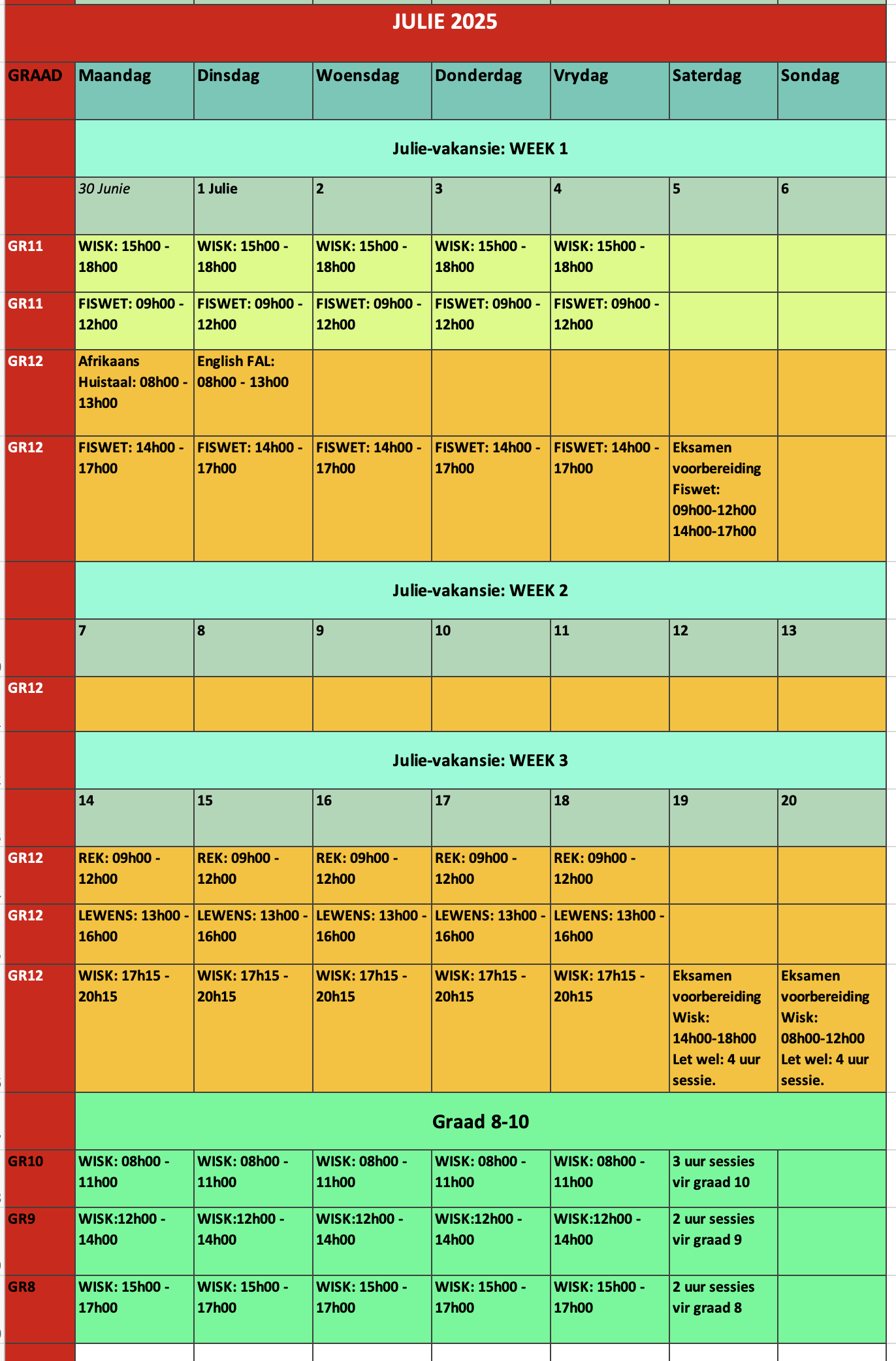 Beeldskool (eBeeldskool) bied topgehalte aanlyn klasse tydens die Julie 2025 skoolvakansie vir Graad 12-leerders (Winterskool) aan. Die onderrigmedium is Afrikaans. Leerders sal goed afgerond word vir die kurrikulum in Wiskunde, Fisiese Wetenskappe, Rekeningkunde, Lewenswetenskappe, Tale: Afrikaans Huistaal en Engels Eerste Addisionele Taal (FAL), asook die eindeksamen waar werk onderrig en hersien word deur ervare onderwysers. Leerder, jy kan jou kennis kom verbreed en nuwe insigte in bogenoemde vakke verkry. Dit sal voordelig wees om die volledige jaarprogram te volg. Leerders wat die direkte interaktiewe klasse bywoon, ontvang na afloop van die klasse die betrokke video-skakel vir herkyk.
